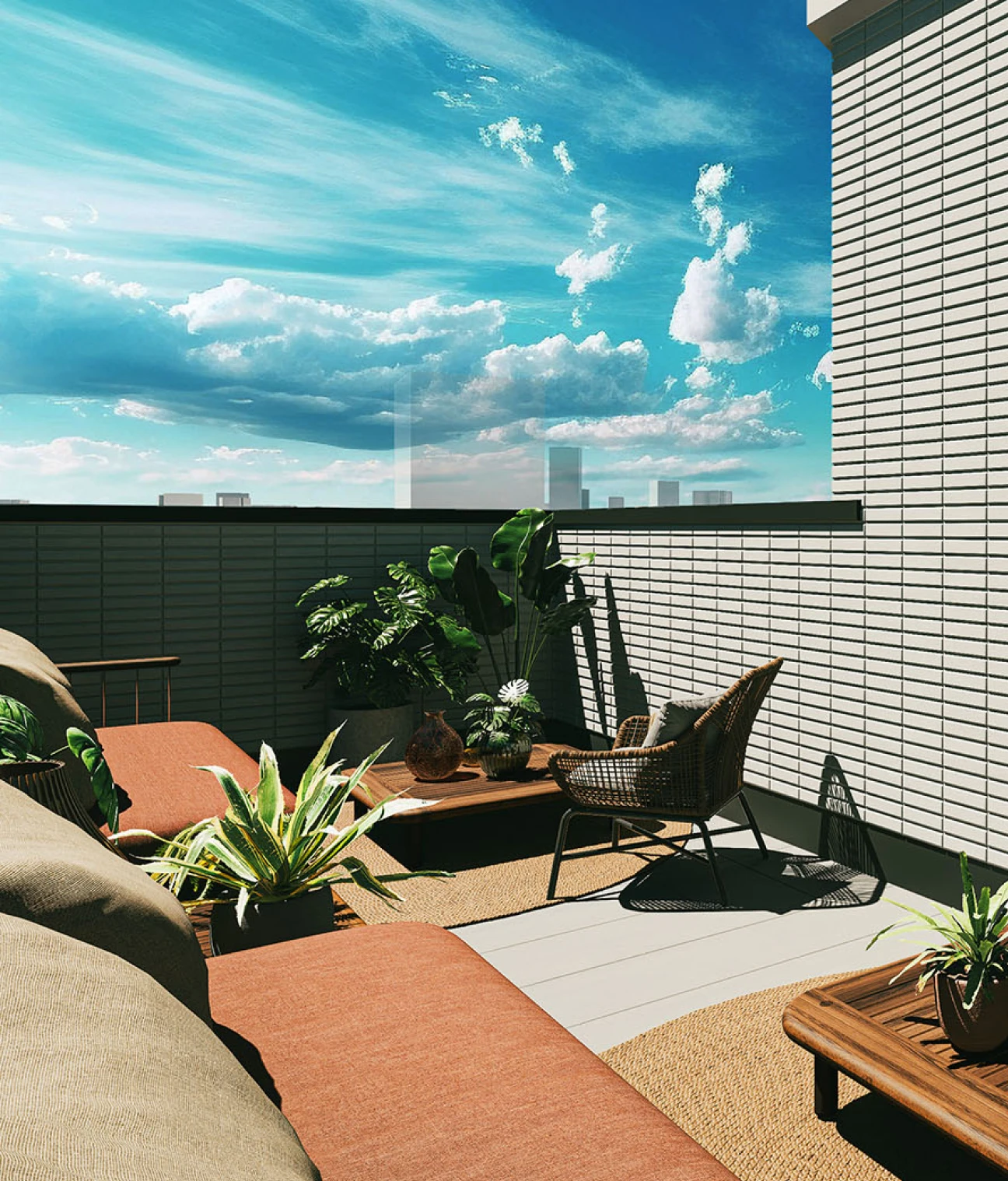 開放感あふれる屋上テラスは、家族や友人と集う特別な空間。BBQコンロ内蔵のセンターテーブルやデザイン性の高い家具が設置され、日常を忘れるリゾートのような時間を提供します。