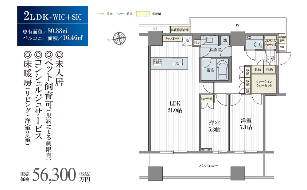 2LDK+WIC+SIC、専有面積80.88㎡、バルコニー面積16.46㎡と広々。