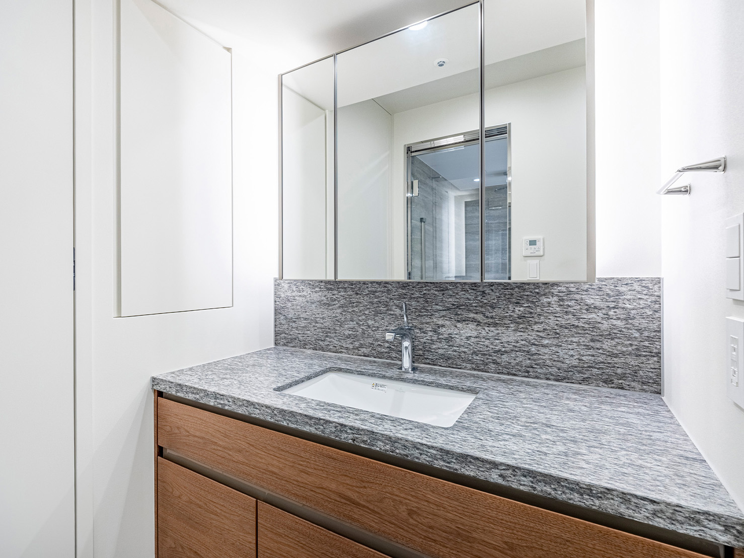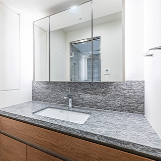 機能性に富んだ三面鏡と奥行きのある引き出しで収納スペースも充実。