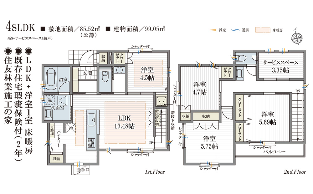 4SLDK、敷地面積85.52㎡(公簿)、建物面積99.05㎡と広々。