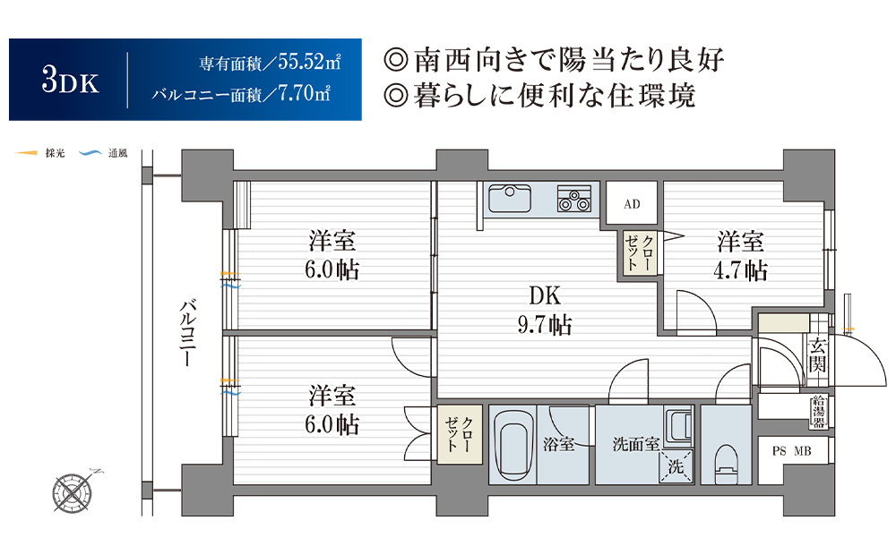 3DK、専有面積55.52㎡、バルコニー面積7.70㎡と広々。