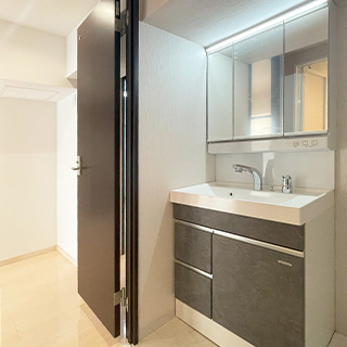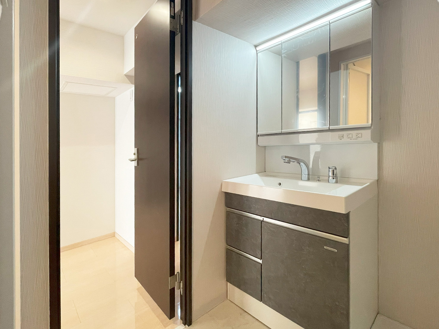 機能性に富んだ三面鏡と奥行きのある引き出しで収納スペースも充実。